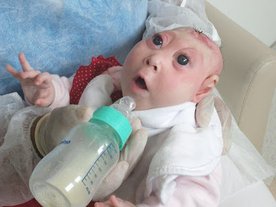 Ontem ela começou a receber antibiótico de maneira preventiva, pois os exames de sangue mostraram uma alteração que pode ser indício de infecção. Isso é normal no período pós-operatório, enquanto ela está com uma região extensa na cabeça ainda em processo de cicatrização. Além disso, hoje o cirurgião precisou dar mais dois pontinhos numa parte da pele que abriu um pouquinho. Mas de maneira geral ela está indo super bem, ativa, mamando, nos surpreendendo como um lindo presente de Deus, frágil e delicado, que veio para nos ensinar a ver além das aparências, a amar além de expectativas, a viver um dia de cada vez e a valorizar pequenas atitudes como poder comer, respirar, viver...